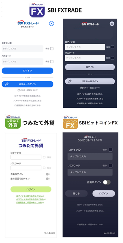 当社のスマートフォンアプリは「SBI FXTRADE」「つみたて外貨」「SBIビットコインFX」の3種類ございます。アイコンやログイン画面を今一度ご確認ください。