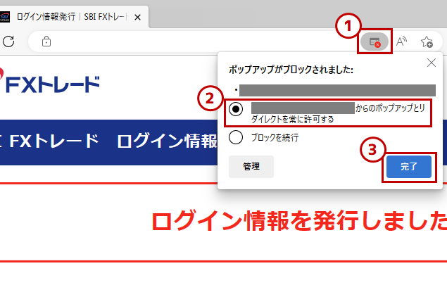 ①アドレスバーの右にあるポップアップブロックのアイコンをクリックします。