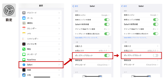 「設定」→「Safari」→「ポップアップブロック」をオフにしてください。